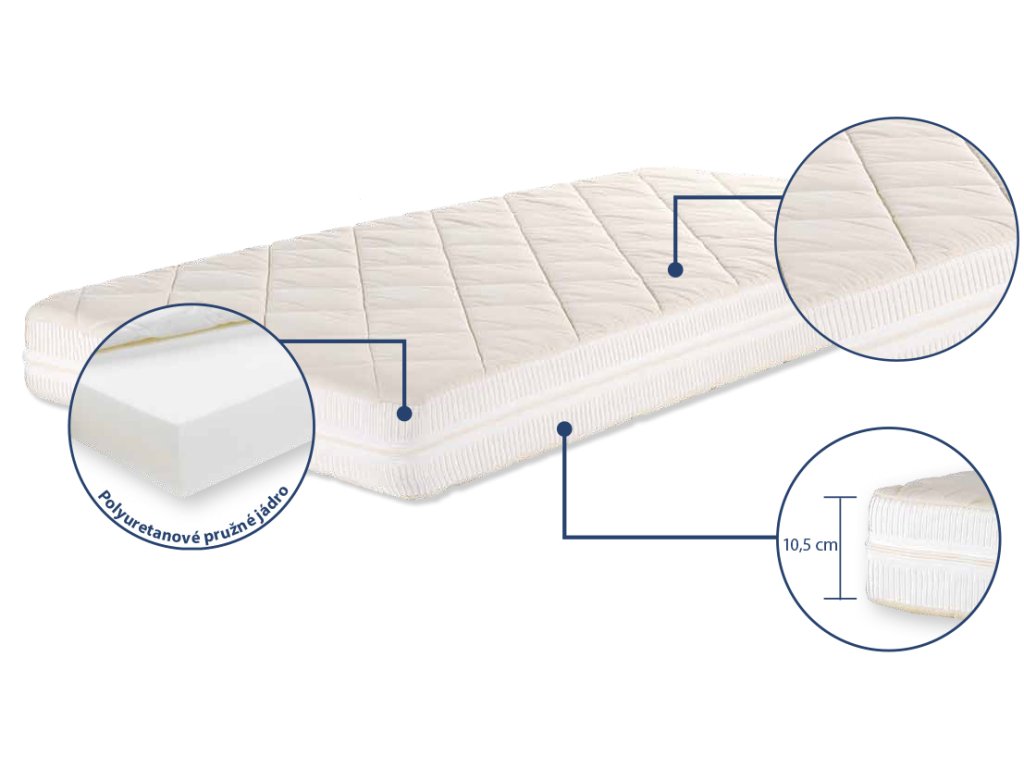 Matrace je vyrobena z pružného pěnového polyuretanu. Jedná se o materiál, který se přizpůsobuje účinně tvaru těla a je velmi flexibilní, ale s dostatčnou tuhostí pro správné držení těla v průběhu spánku. Neobsahuje CFC.