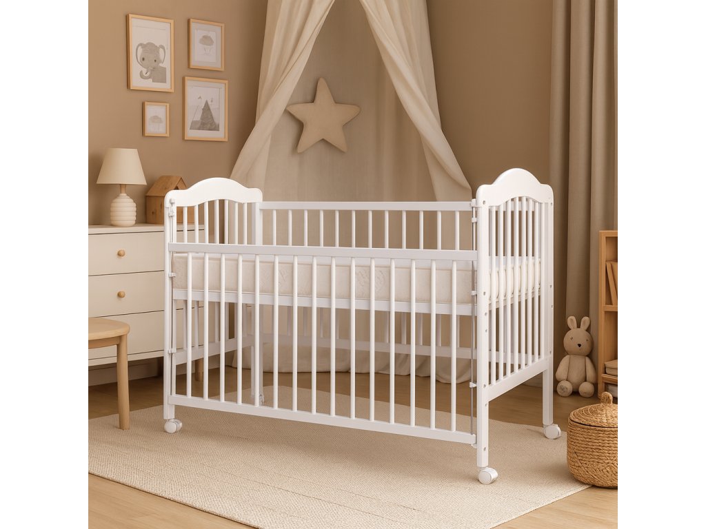 Kolečka ani matrace nejsou součástí postýlky, ale je možné si je objednat z naší nabídky.