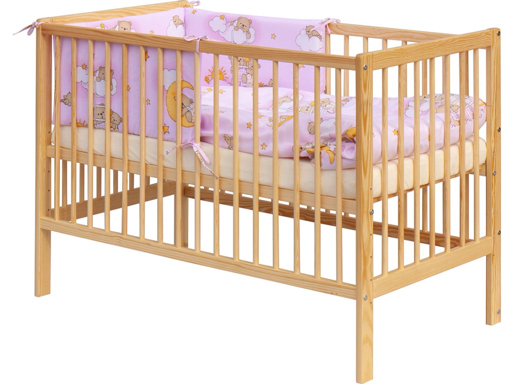 1. Wooden cot 120x60 cm - natural, solid pine, 3 pull-out partitions, 6 positions of the grate, the cot legs are pre-drilled for the possible fitting of wheels