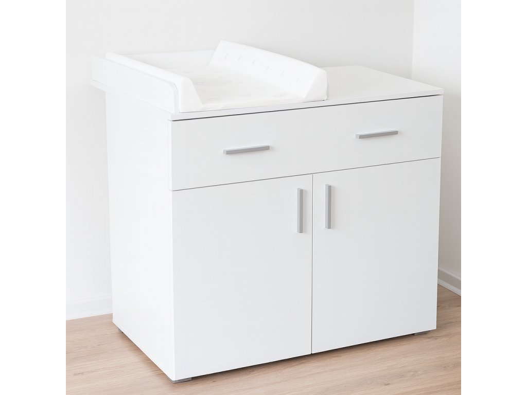 Changing chest Scarlett is made of laminate. The dresser has one drawer with pull-out and a spacious cabinet with a shelf. The changing extension can be attached to the left or right side of the chest of drawers and is a standard part of the chest of drawers. The chest of drawers can continue to be used in the student room when the changing table is no longer needed.