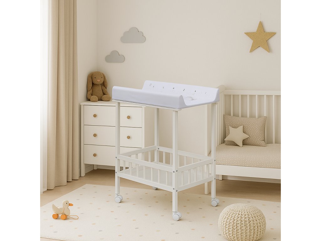 Practical changing table with two shelves made of HDF board. The top changing table is made of polyurethane covered with washable PVC, reinforced with MDF board. Its elegant and simple design fits into any interior. When changing diapers, you can have everything you need at your fingertips.