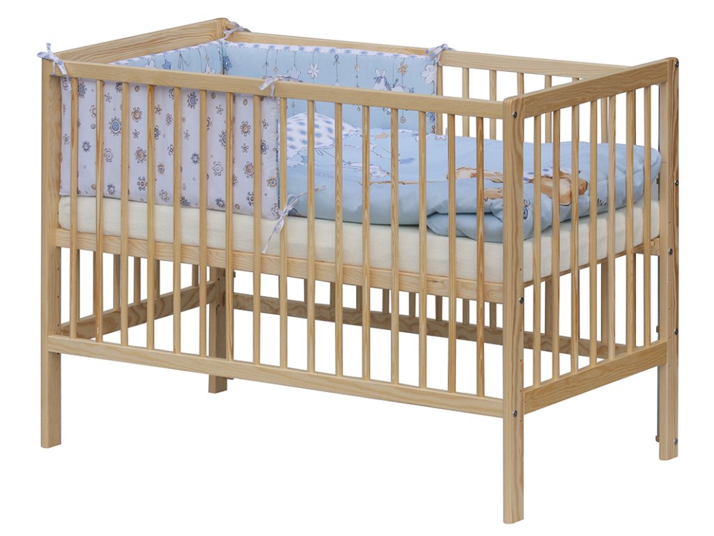 • Łóżeczko dzieciece z wyjmowanymi szczebelkami 120x60 cm, naturalny, sosna masiv, liczba stopniow położenia - 6. Nogi łóżeczka są wstępnie wywiercone dla kółek.