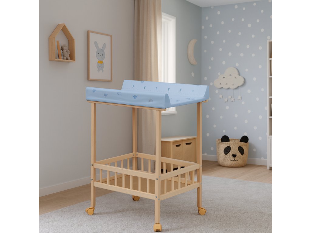 Praktyczny stolik do przewijania z dwiema półkami z płyty HDF. Górny blat do przewijania z poliuretanu pokryty zmywalnym PVC, wzmocniony płytą MDF. Elegancki i prosty design pasuje do każdego wnętrza. Podczas przewijania wszystko masz pod ręką.