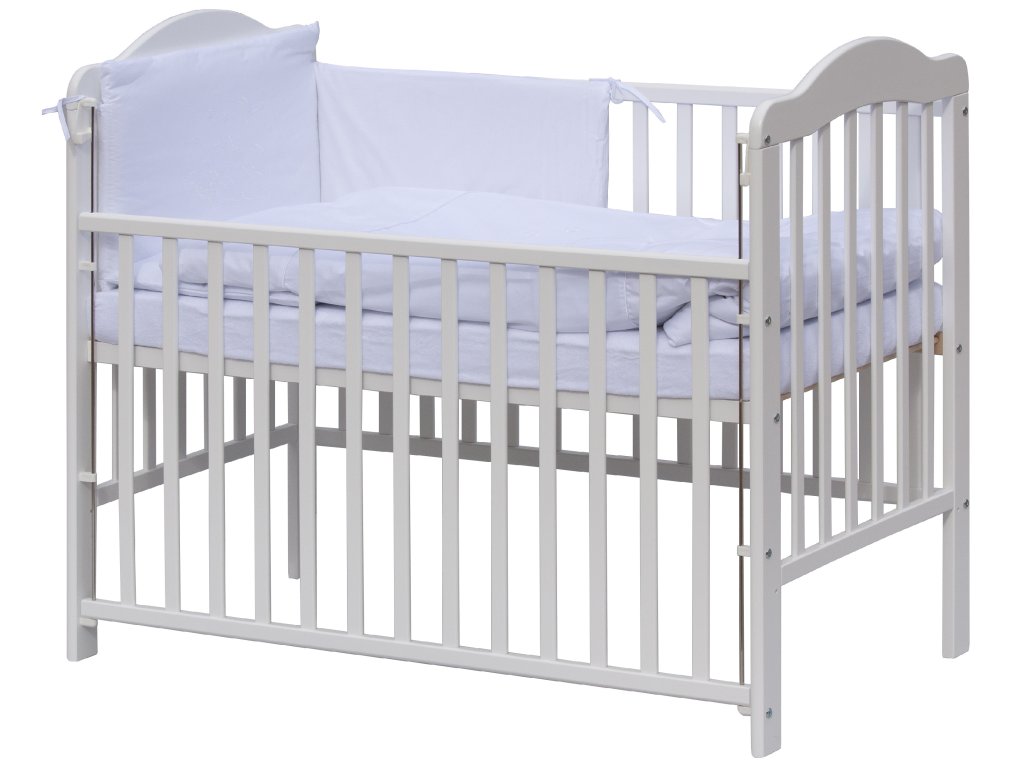 1. Dětská dřevěná postýlka 120 x 60 cm - bílá, masiv borovice, stahovací bok, 6 poloh roštu