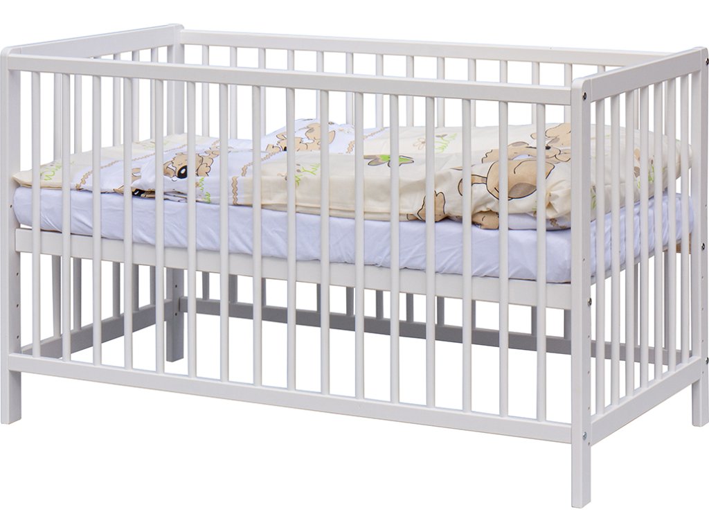 1. Dětská dřevěná postýlka 120x60 cm - bílá, masiv borovice, 3 vyndavací příčky, 5 poloh roštu