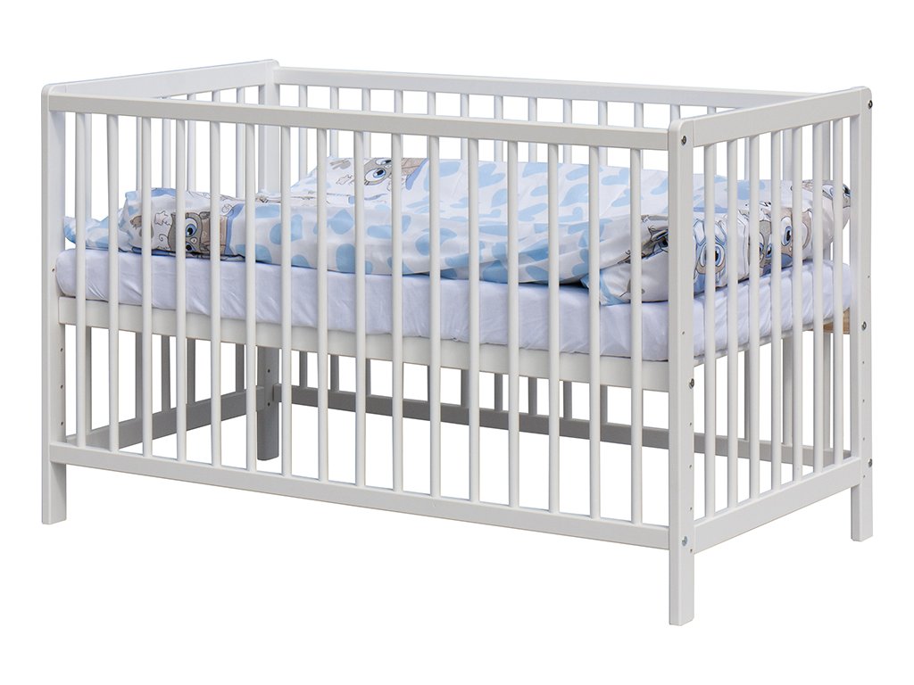 1. Dětská dřevěná postýlka 120x60 cm - bílá, masiv borovice, 3 vyndavací příčky, 5 poloh roštu