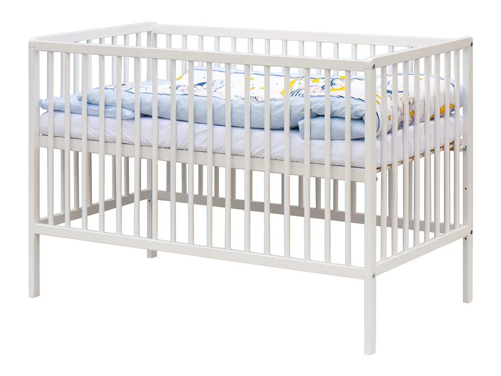 1. Dětská dřevěná postýlka 120 x 60 cm - bílá, masiv buk, 3 vyndavací příčky, 2 polohy roštu,