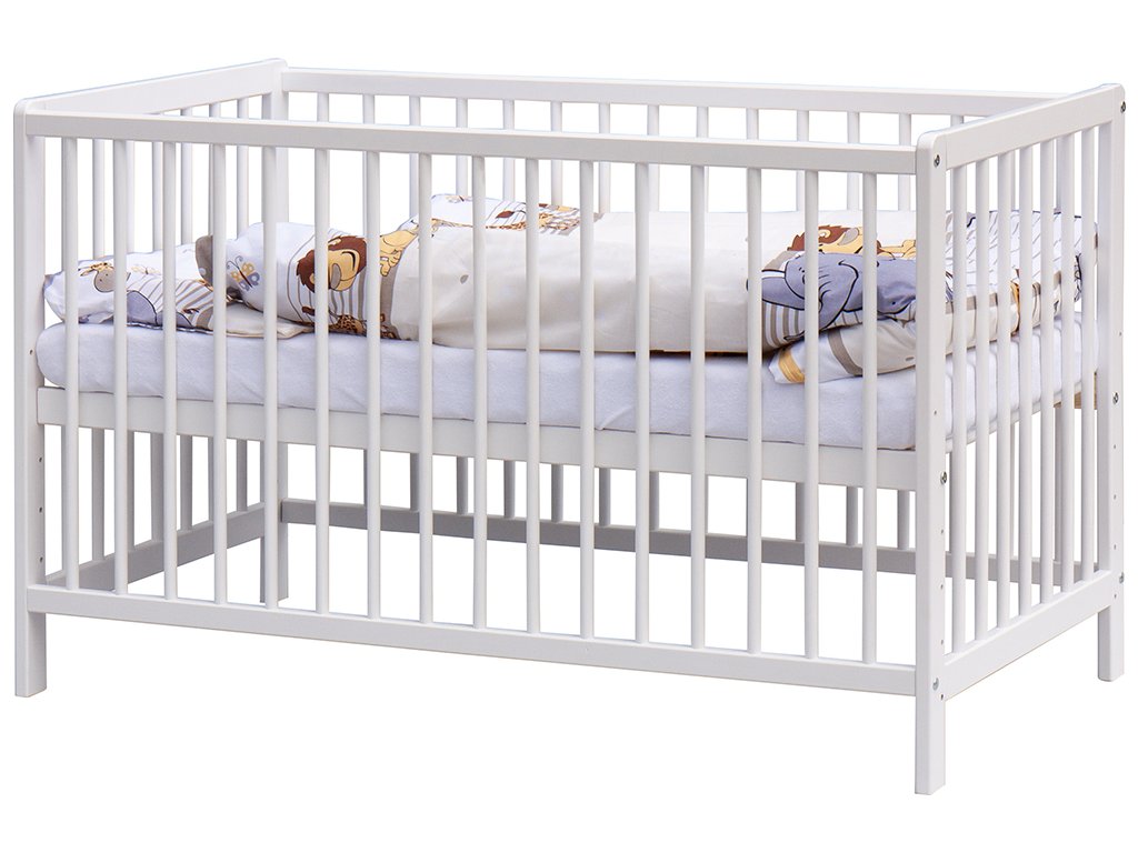 1. Dětská dřevěná postýlka 120x60 cm - bílá, masiv borovice, 3 vyndavací příčky, 5 poloh roštu